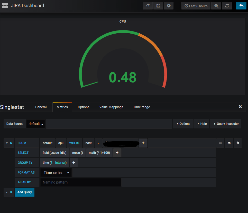 The particularly tricky one to do is the CPU Graph and guage. Telegraf will breakdown CPU usage into io_wait, user, system, etc. To be fair, this is how it’s recorded to Linux internally, but to get a unified number, I had to take the idle time on the CPU, multiply it by -1, then subtract it from 100.