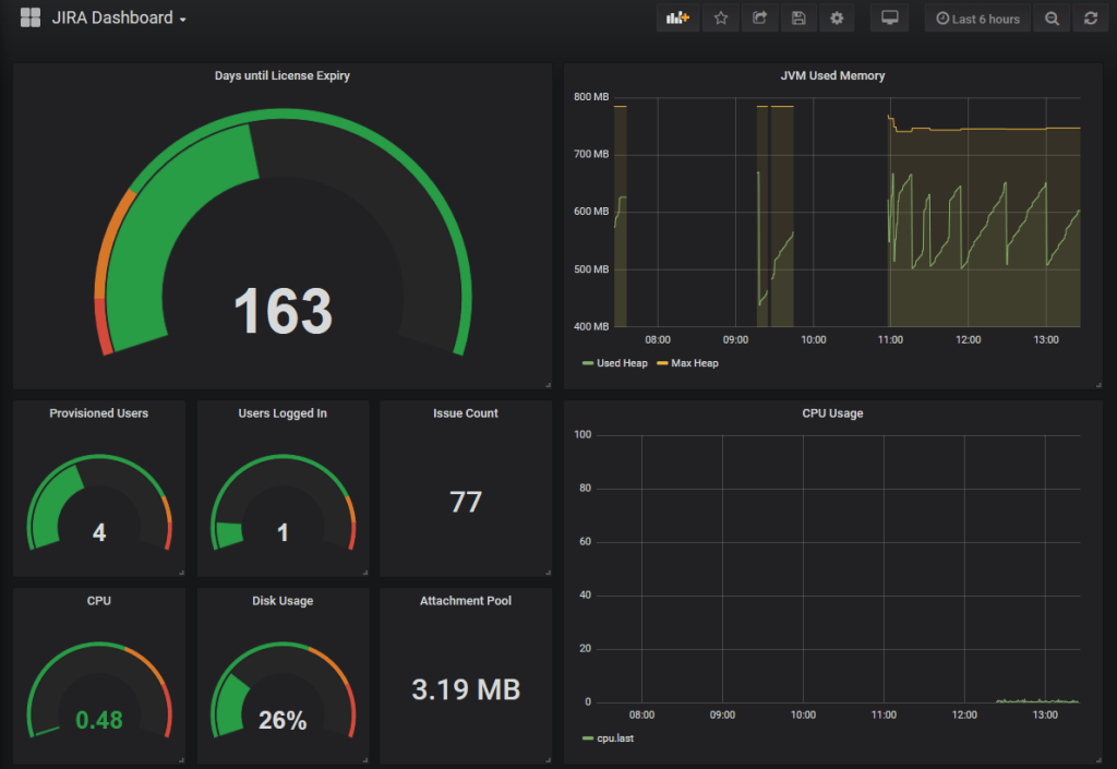 Luckily I had another tool in my toolbelt. I had previously setup Grafana and InfluxDB/Telegraf for use on other systems. It was merely a matter of setting up telegraf on the JIRA server, and start pumping in the required data that way.
