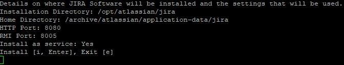 The last question here before JIRA is installed is asking you to confirm all the settings you entered. Just run over them to make sure they are correct, then hit enter.