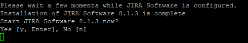 We actually do not want to start JIRA yet, as we have one more step to complete before we can give it a first boot. So type “n” then enter. This will complete the installer run.