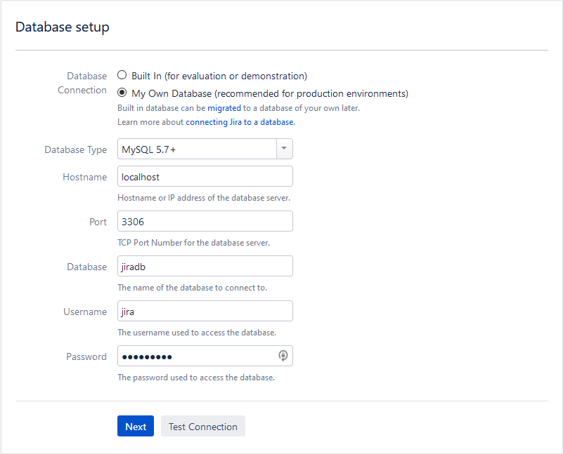 The next screen will ask you for some details on the database. Here you will select “My Own Database”, then enter the details. The database, username, and password will have been set during the “JIRA’fying this DB” section from last week’s post.