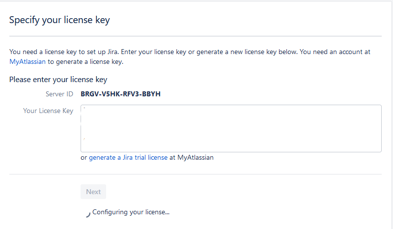 The next screen will ask for your license key from Atlassian. Copy/Paste it from https://my.atlassian.com and click next to proceed.