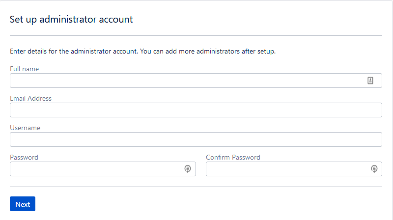 The next step will ask you for a admin username and password. A word of note here: Even if you intend to use Active Directory or Crowd to manage users, you will still need at least one local admin account. The reason why is you cannot edit a directory from an account associated with that directory, even if that account has the correct Admin privileges This means you will need a local account to modify that directory.