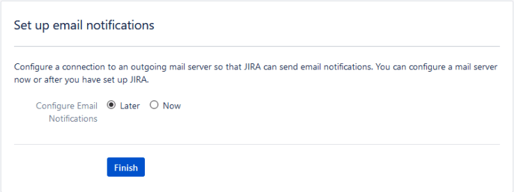 Click finish, and JIRA will take a second while it finalizes some system settings. However, we are not done yet!