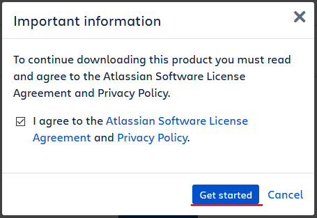 To get the installer, I’ll go to the JIRA Download Page, the click All Versions. From there, I’ll navigate to my target version, then select “Linux 64 bit”. At this time I have the same options of downloading it to my local computer and transfering it, or using wget to download it directly to the server. Be sure if you do the latter, that the URL you copy ends with the file extension “.bin”. The link to the download should be the “Get started” button that lights up after you agree to the Atlassian Software License Agreement, if you wish to copy/past it to the server.