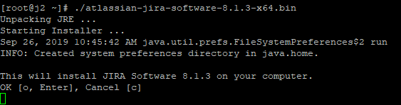 The first question it will ask is if you really want to install JIRA here. Take a moment to confirm the JIRA package and version are correct. I intended to install JIRA Software 8.1.3, so this all checks out. Hit enter or “o” followed by enter to proceed. Press “c” then enter to cancel the installer.