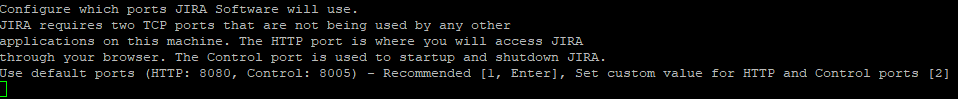 Next JIRA will ask you which ports you want it to use. As JIRA does not run as root, it cannot run natively on ports 80 and 443. Unless you plan on running more than one JIRA instance on the same server, you can keep to the defaults here.