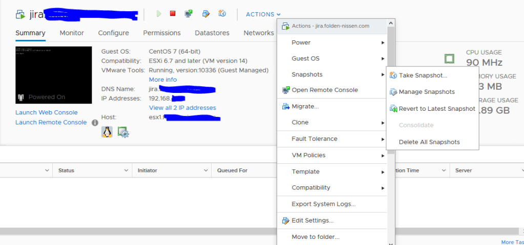 Before I have your ESXI admins after me with torches and pitchforks, I should note here. The way I understand it, a snapshot setups up a way for ESXI to journal all the changes made to a system within a file, and revert back those changes. That means the longer a snapshot sits on a system, the larger it becomes. So always go back and remove a snapshot after you finish your testing. At the very least, it keeps things from getting messy.