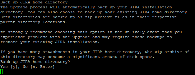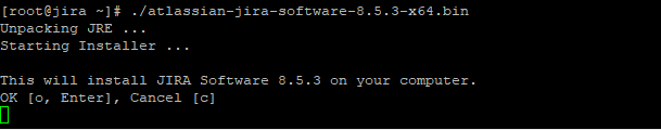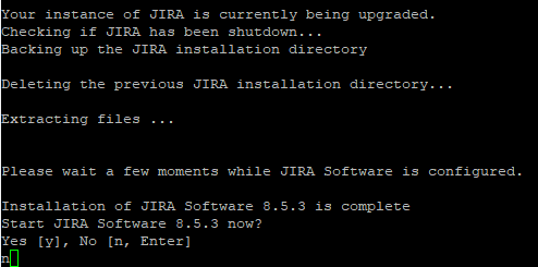 Here, JIRA will backup the current install directory, then replace it with a new one for the new version. For JIRA 8.5.3, it will not copy over any modifications you make, but we’ll get to that in a bit. Once done, it will ask if you if you want to start JIRA. Say “No”.