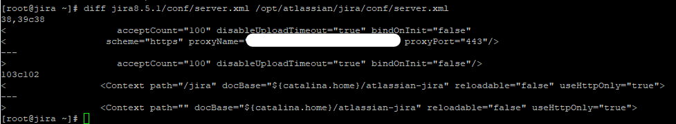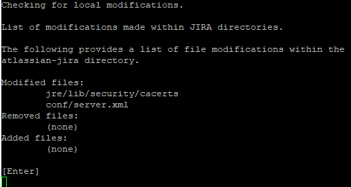 Next JIRA will check for modified files. These normally aren’t but two or three, with the most common suspect being <jira_install>/conf/server.xml. Open up a separate terminal window and copy these out of the install directory. Once you have these backed up, hit enter.