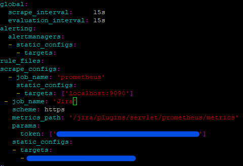 Here we will be adding a new “job” to the bottom of the config. You can copy this config and modify it for your purposes. Note we are using the URL we got from the Prometheus Exporter. The first part of the URL (everything up to the first slash, or the FQDN) goes under target where indicated. The rest of the URL (folder path) goes under metrics_path. And then your token goes where indicated so that you can secure these metrics.