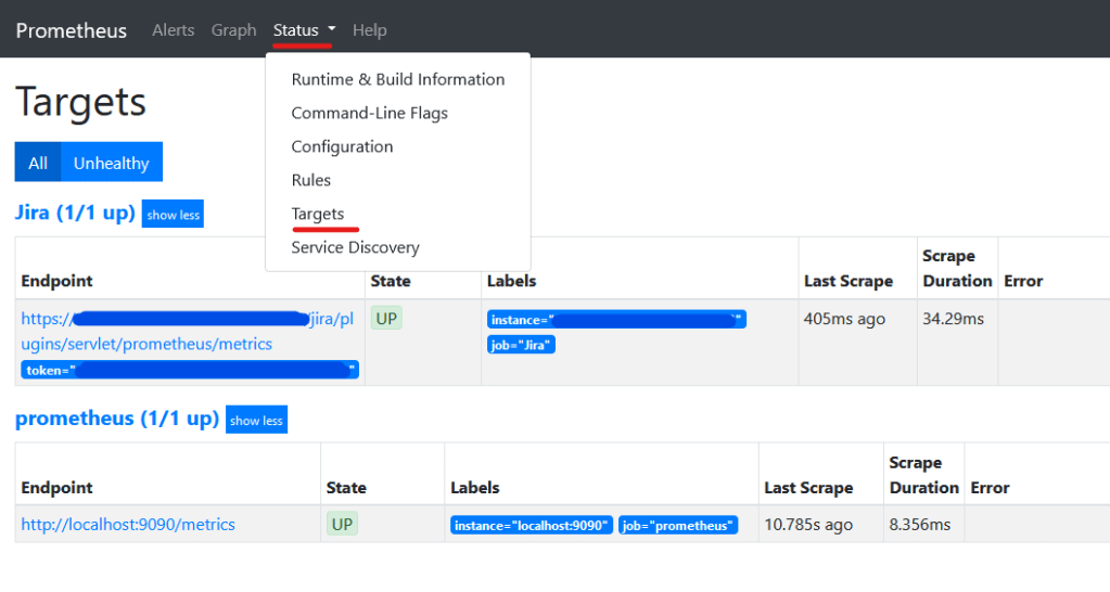 From here we can open a web browser, and point it to our Grafana server on port 9090. On the Menu, we can go to Status -> Targets and see that both the local monitoring and JIRA are online.