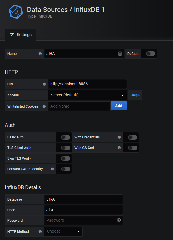 Now that we are in, we need to setup a database and user for our JIRA data to go into. As a rule of thumb, I like to have one DB per application and/or system I intend to monitor with InfluxDB.