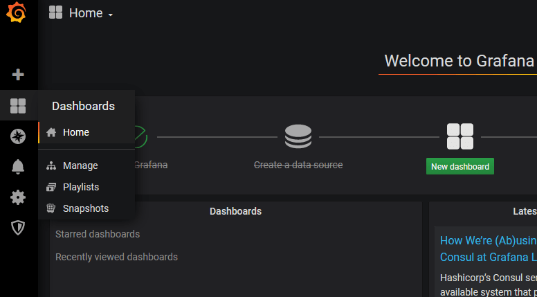 On Prometheus, all we’ll need to do is set the URL to be “http://localhost:9090. Enter that, then click “Save & Test”. And that’s both Data Sources done! Now we can move onto the Dashboard. On the right sidebar, click through to “Home”, then click “New Dashboard”