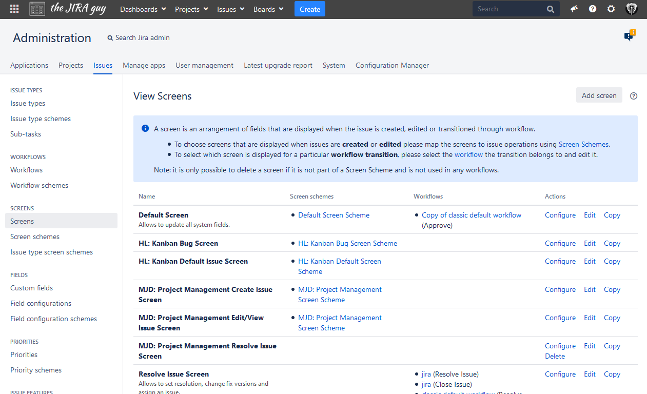 My experience has been standardizing workflows is a bigger fight than screen schemes, which is why I chose to lead with that. People are willing to be flexible on fields – most people don’t use most custom fields anyways. But when you start messing with their workflows, you are messing with how they work. And yeah – that is part your job – but it’s going to be a fight. So start out with the screen schemes and build up some good will. That will make this easier.