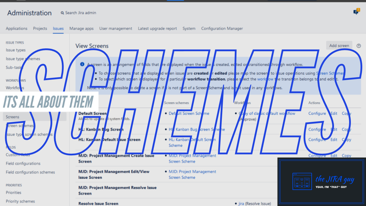 And the third, and I’d argue the most important reason to consider standardizing your schemes is your sanity. Look, there is only so much JIRA Admin to go around. If you are lucky, your organization has two or three of them to help out – but that’s usually for the largest organizations. Most small and medium businesses, it’s on you. Having standardize schemes stops you from having to play “What impact will this change have?”. You’ll know, and be able to get on with it that much faster.