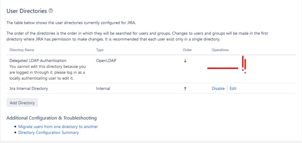 There are no options to edit the AD Directory (or LDAP in my case…still). This is because you have just fallen for our first Gotcha. JIRA does not allow you to modify a directory if the account you are logged in with is a part of that directory. This is to prevent a situation where you modify a directory and manage to lock yourself and your entire company out of JIRA.