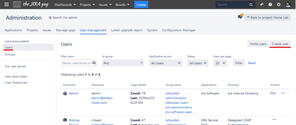 From here, create yourself a user within the JIRA internal Directory, then add it to the jira-administrators group to give it permissions. Log into this account and use that to change the settings.