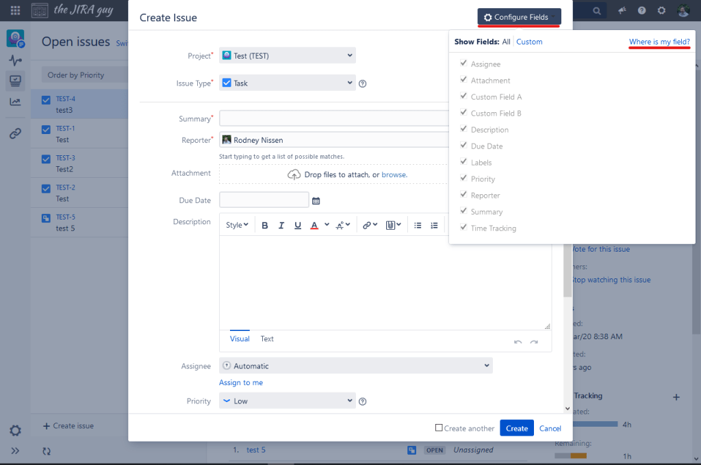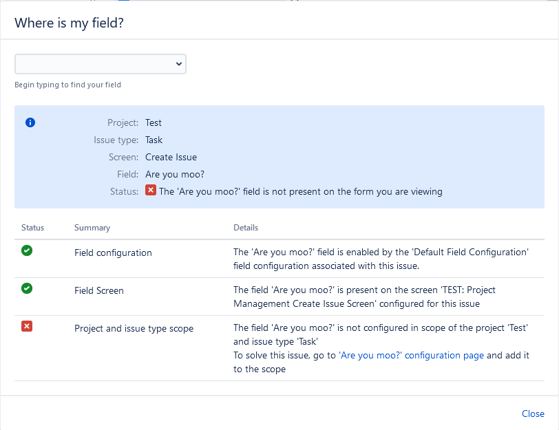 To test if this was a case, go to the project, then click “Create” (YOU HAVE TO GO TO THE PROJECT FIRST). Once your create screen is up, click “Configure Fields” then “Where is my field?”