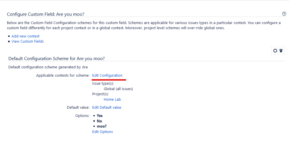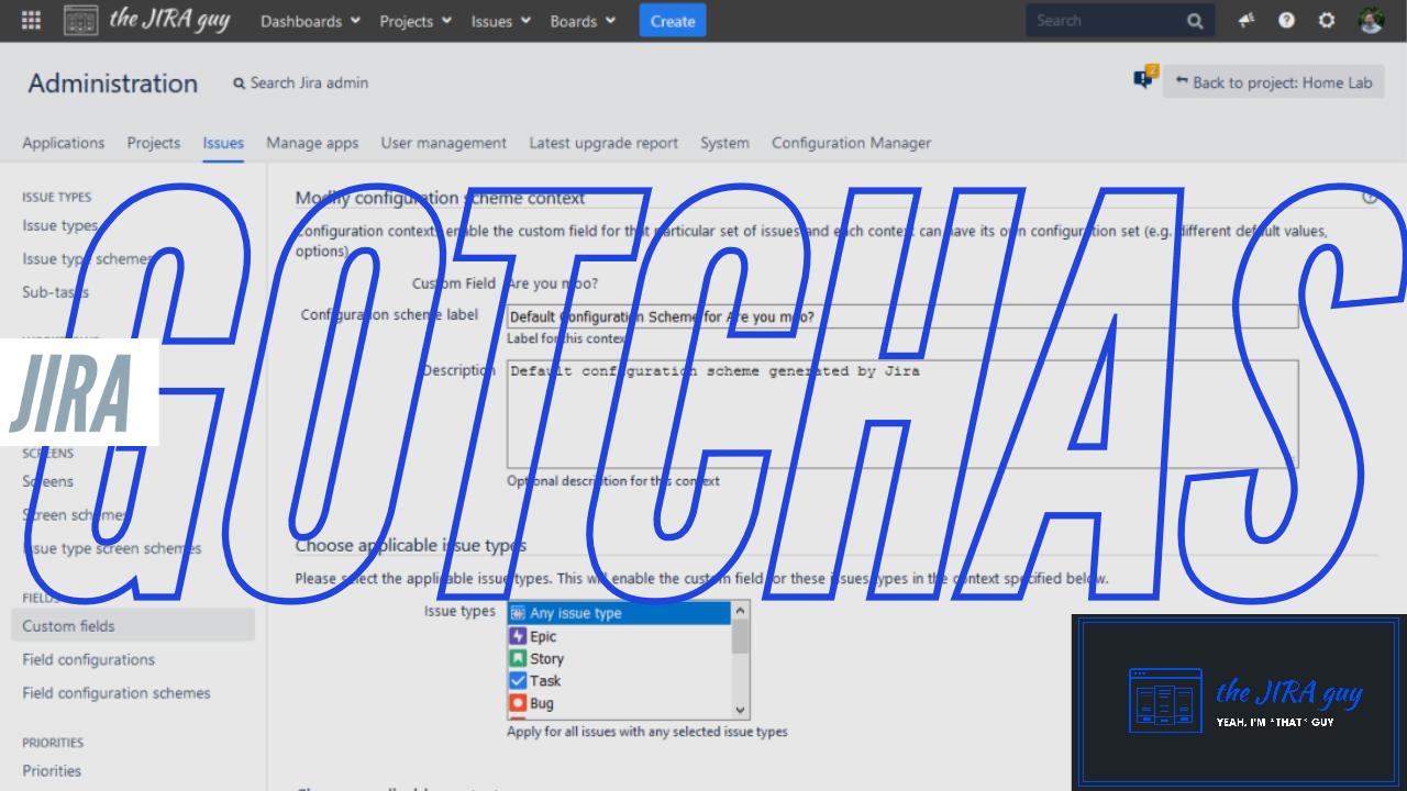 That is until you get an email saying that field is still not showing up for them. You have just fallen for our second gotcha. All fields have a Field Context that you can use to limit what projects that field is allowed to be used on.