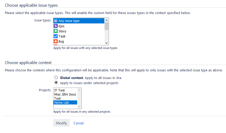 From here, make sure your issue types and project context are appropriately set, then click Modify. You will need to reindex after this, but the field should now be accessible!