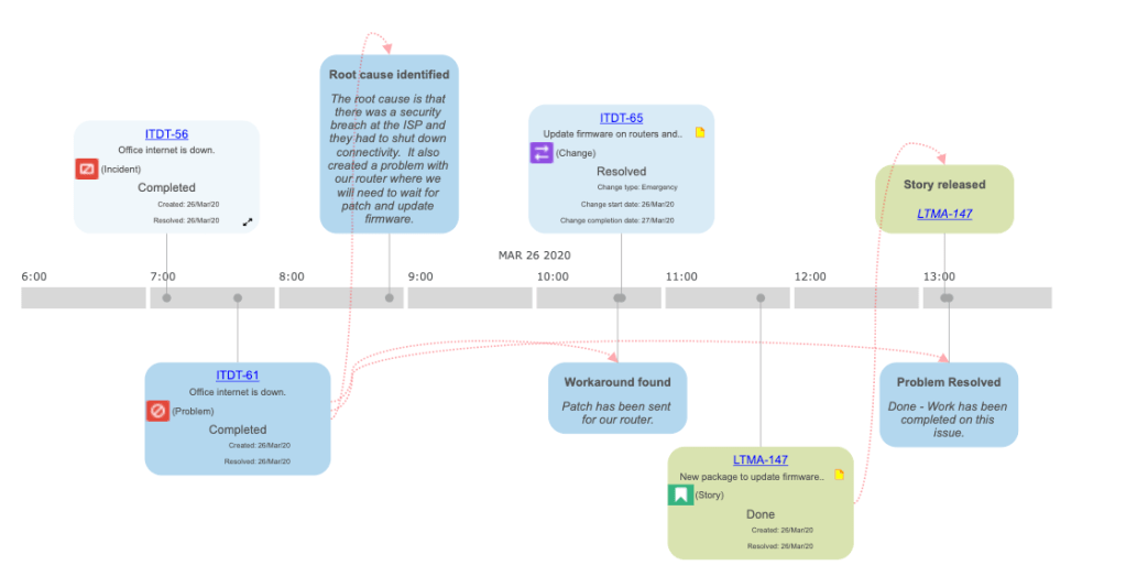 This first report is something I REALLY like. It is simply a report showing the timeline of a problem – from initial incident to Dev story resolution. This is similar to what Atlassian is rolling out for JIRA Service Desk and Opsgenie in the cloud, but you can get this in your JIRA Server/DC instance today!