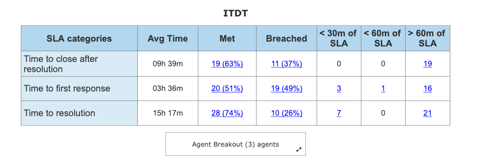 In speaking of SLA’s, getting aggregations of that data can be troublesome. Yeah, you can see which ones have breached, but how is your team doing as a whole. There was a report for that too: