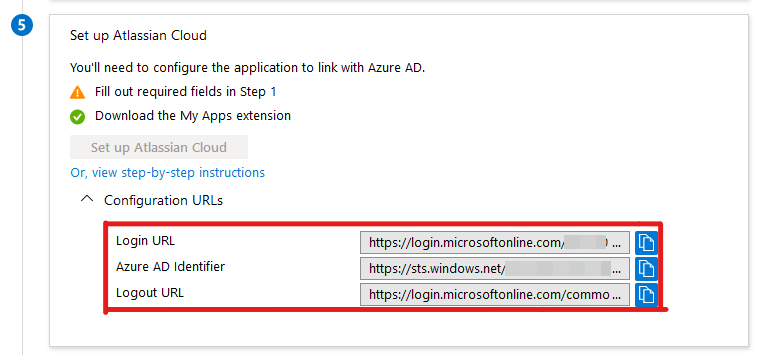 - Now we will need to give Azure some information on your Atlassian Cloud setup. To do so, copy the “SP Entity ID” and “SP Assertion Consumer Service URL” fields from the next page.