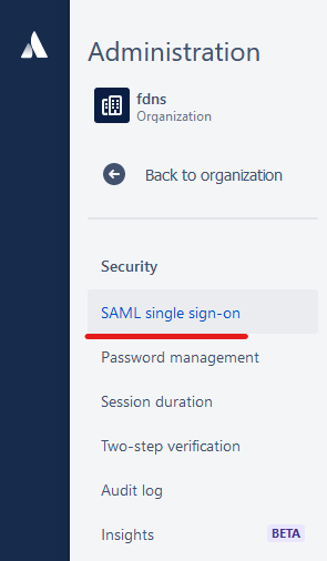 - Now we can switch over to Atlassian and start the setup there. Under your https://admin.atlassian.com admin page, Select Security →SAML single sign-on