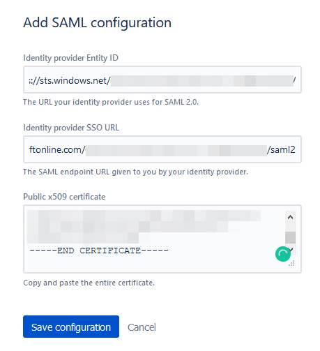 - Now we can start entering the information we got from Azure AD. Be sure to pay attention to how I have it mapped below, as Atlassian and Azure have different names for each field.