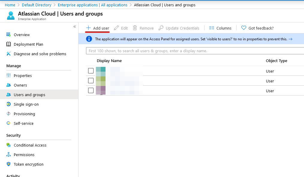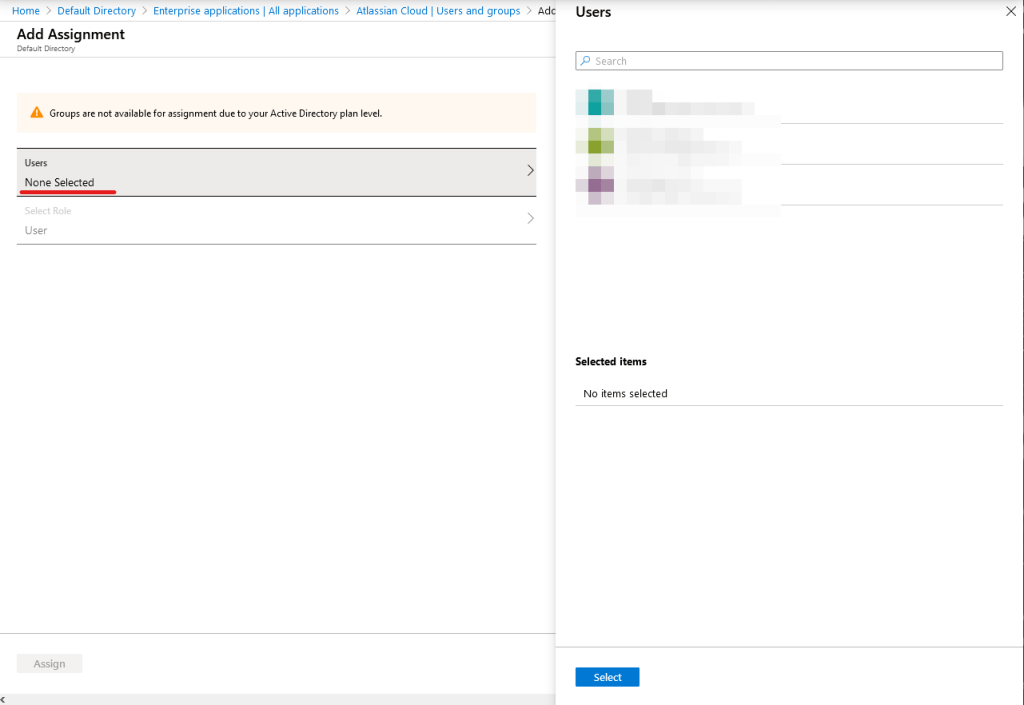 - Click “Users” then select the Users that Azure should sync with Atlassian Cloud. Repeat for Groups that you would like to also sync over to Atlassian Cloud.