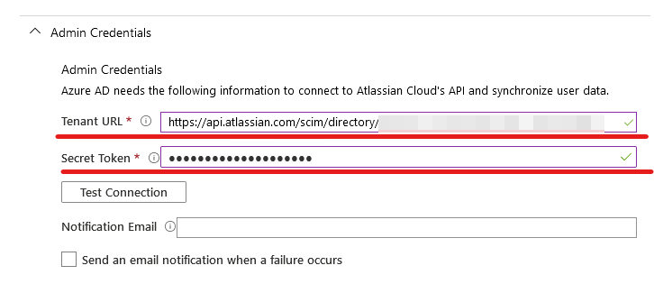 - Back within Azure, we will enter both of these into the Admin Credentials section. Again, be careful here as Atlassian and Azure disagree on what to call them.