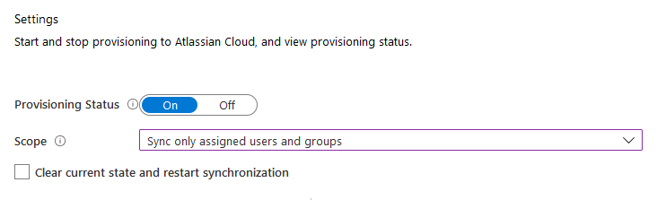 - Under Settings, Set “Provisioning Status” to “On,” then Set Scope to “Sync Only Assigned users and Groups.”
