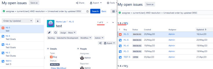 However, if we look at the question, they are asking for just a JQL to return a count. They don’t mention dashboards at all in their question. Considering that, we can definitely say that JQL will not return that directly, but you can still gather that information from the query screen. If we look at the places marked in red below, we can see the total number of issues returned in both the Detail view and the List view.