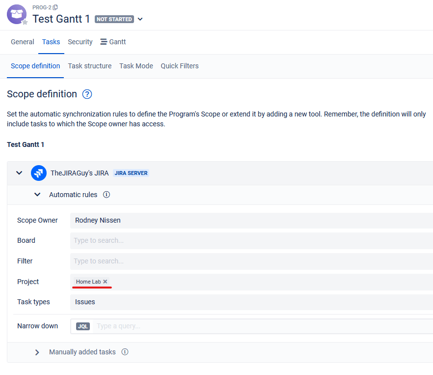 After this, I click “Scope definition” and made sure it included one of my test projects under the “Automatic Rules” dropdown.