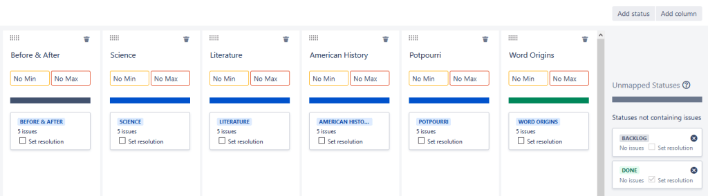 Now that we have the workflow and the fields, we need to work on the Kanban board. I started by going to the Columns and removing all the default options – replacing them with my categories. I mapped each Column with its appropriate status, leaving the backlog and Done statuses unmapped.