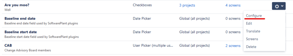 The first stop we’ll make is modifying your Field context. We choose this first because, by default, it should already be set up correctly for you. On your Custom Field List, click the “Actions” gear on the Field you are interested in, then click “Configure.” You should see a form to “Configure” the Custom Field.