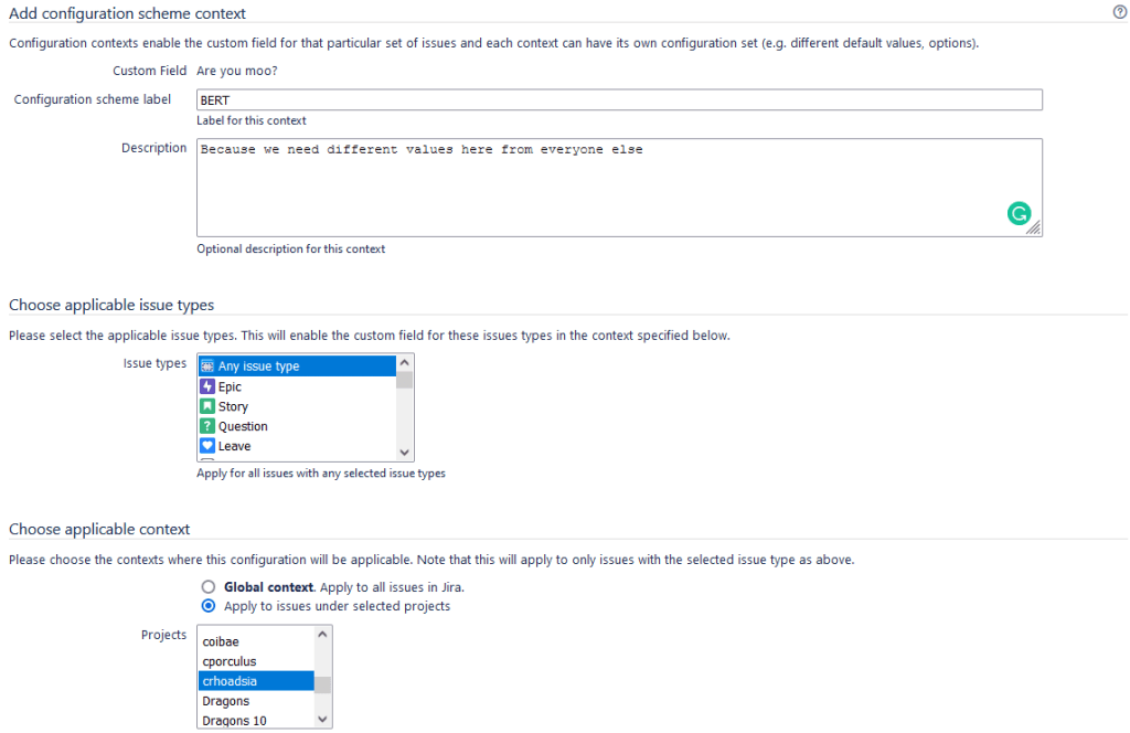 This setting is where Jira and I will have to disagree. According to Jira (via their tool in Data Center), you should define a limited and specific context for every custom field in your instance. Setting up your field contexts like this will save time on your Index, as you won’t have to index a field for projects that don’t include it.