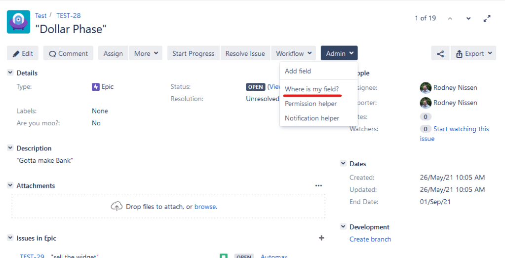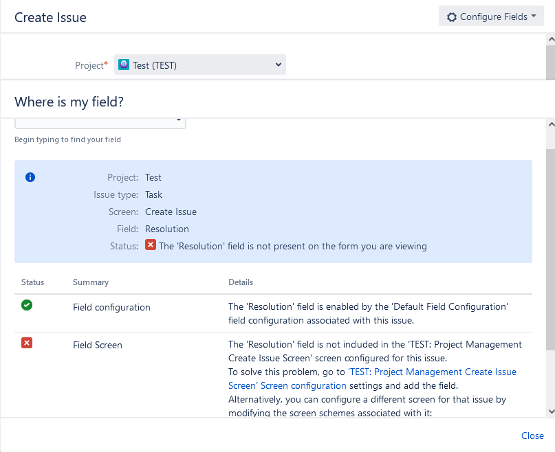 Thankfully, Atlassian gives a tool to debug just this case. As there are several places the problem can be, this tool has saved me many MANY times. For example, if you are on “Create” or “Edit,” start by going to the upper right-hand side of the pop-up, click “Configure Fields,” and make sure “All” is clicked. If it is, then click on “Where’s My Field?” This tool will then tell you for any inputted field what configuration changes need to be made to show up on that screen. If you are on a View screen, click “Admin -> Where’s my field?” to get to the same screen. If you take nothing else away from this deep dive, I hope you take this one tool with you to use.