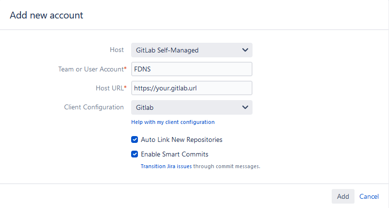 The first Integration is set up in Jira using its DVCS Accounts page. This will allow you to use the Developer Panel in your issues and enable you to use Smart Commits to perform actions within your Jira instance. An important caveat that none of the documents mention is for this to work, your Repos on Gitlab must be under groups and not users. Ask me how long that took me to figure out.