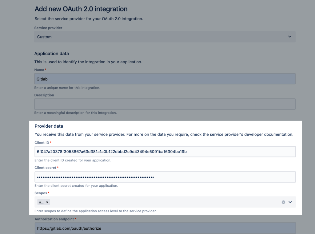 We’ll skip down to the Authorization endpoint. Here, we’ll enter our Gitlab URL, followed by ‘/oauth/authorize’. Do the same for Token endpoint, except it will end in ‘/oath/token’. So both should look like this: