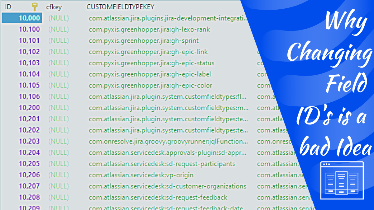 We could talk about this more, but it comes down to one question at the end of the day. Will the find-and-replace in someone’s code for hard-set values (that, let’s be honest, should have been variables to start with) be more or less risky than this process? You have to schedule a change control, bring Jira down, make unsupported direct DB changes, bring it back up, find any problems, bring it down and make more (again, unsupported) DB changes and bring it back up. And you will still likely have problems by the time you are done. And that’s if you don’t corrupt your whole instance in the process.