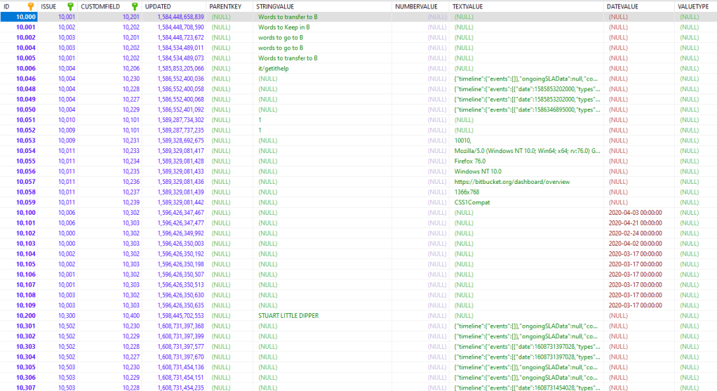 IF we look at the customfieldvalues table, we can see this reference in action. This table is where Jira stores the information you put into *most* custom fields, and the data looks as follows.