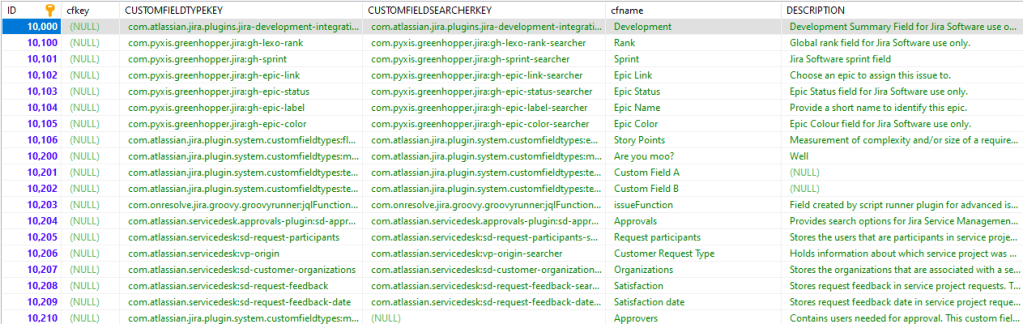 So, for those of you who don’t yet know, internally, Jira doesn’t reference fields by their name. Instead, each field is assigned a unique ID within the customfield table upon creation. This ID number is how the field is referred to anywhere else information is stored – particularly in the customfieldoption and customfieldvalues table. If we look at a sample of the data in the customfield table, we see the following.
