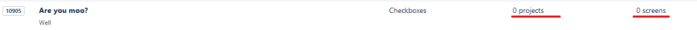 Okay, your contexts, screens, and projects are no longer linked to “Are you Moo?” because they are all still looking for custom field 10200, which no longer exists thanks to our meddling. Alright, so we change customfield_10200 to customfield_10905 in the configurationcontext table, restart Jira and reload the page…and no change.