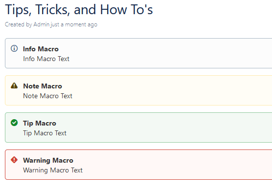 That’s where this series of Macros come in. Using the Info, Note, Tip, or Warning macro generates a small text box of that color, allowing you to draw attention to various details that you want to ensure readers don’t miss.