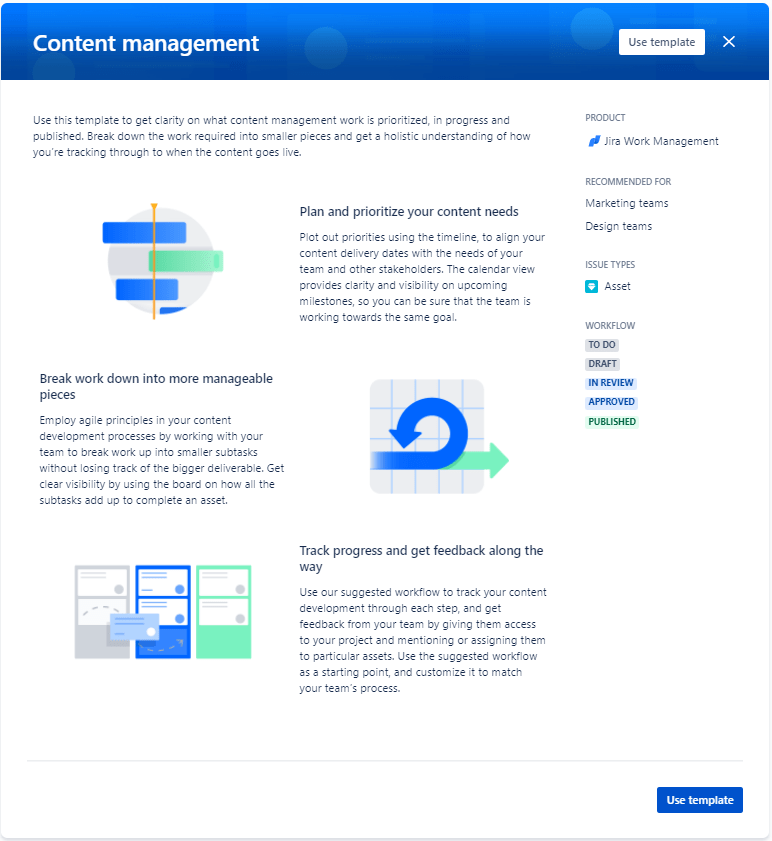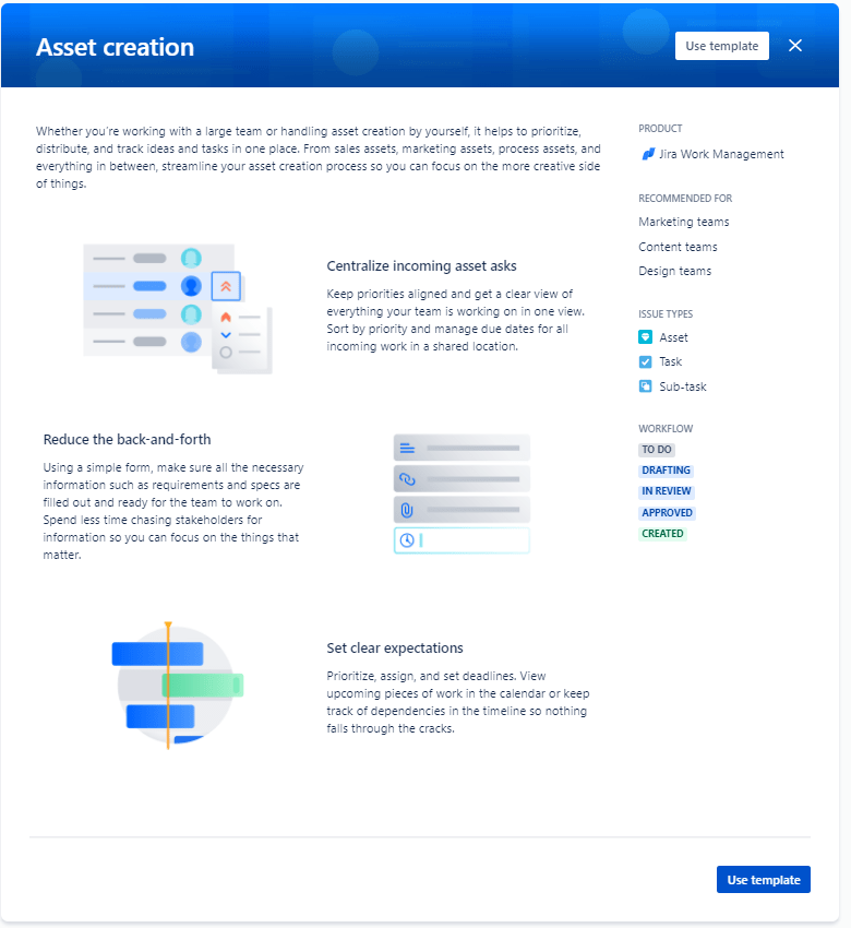 Now, I’ve made no secret that I use Trello to manage this blog’s content. However, I’ve been eyeing an experiment with this Template for a while now. It only has one issue type, Asset, and a relatively straightforward workflow. The only trick is that it can move from Draft to In Review and back as a loop before moving ahead to Approved. I’ve had a similar ask before for a workflow, so I appreciate the approach. So, pretty solid Template if you need to track such items. Nothing too exciting, but does the job well enough, I’ll give it a solid B.