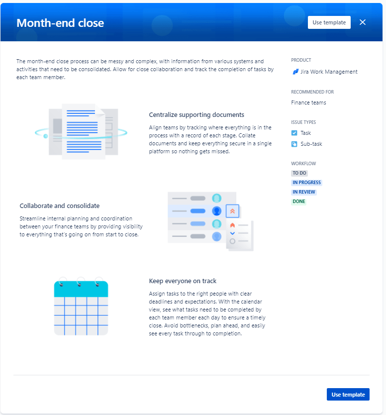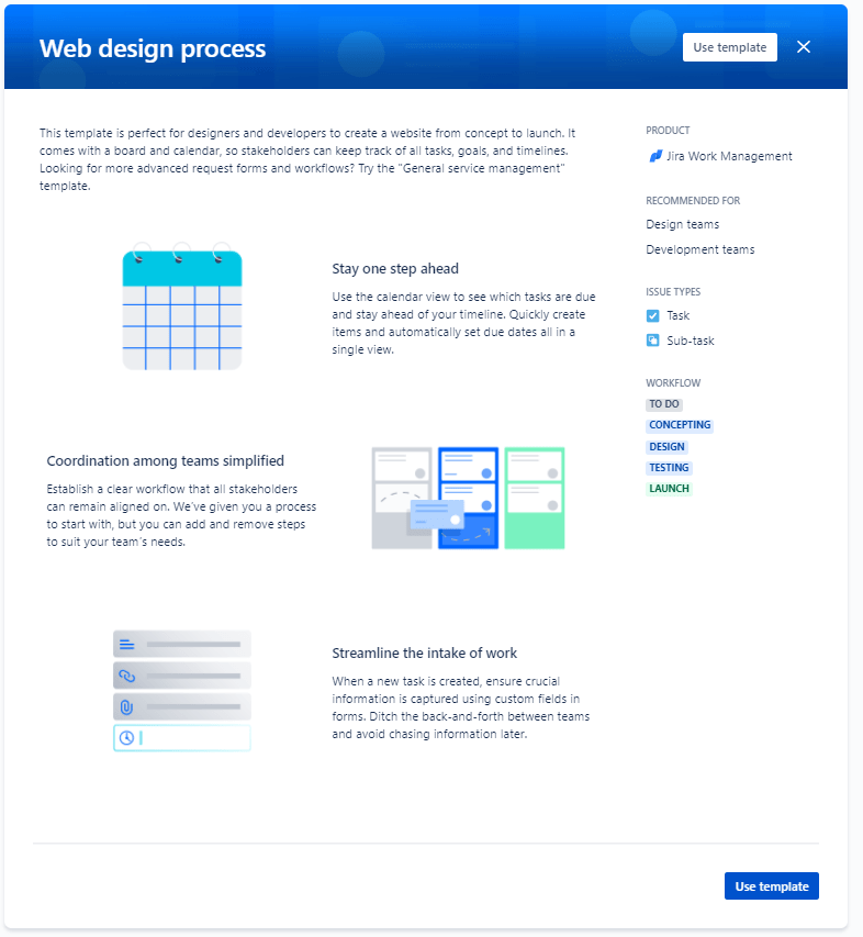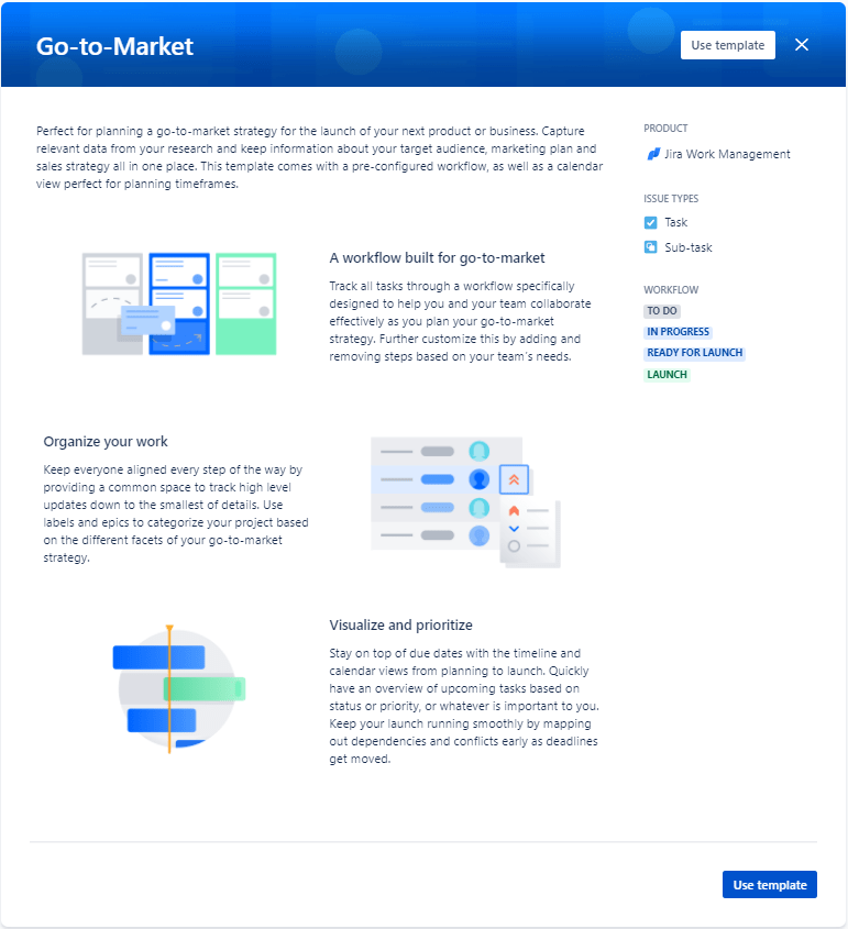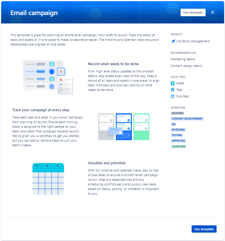 I find the fact that the Email campaign is so different from Content management interesting. I suppose I’ve never had cause to consider such things, but having it go through testing makes sense given the number of browsers, email clients, and situations that could arise. This template also has a sub-task issue type and the standard “To-do, In Progress, Done” workflow. However, I can see this being adapted easily to other similar projects, so this might be another jumping-off point.