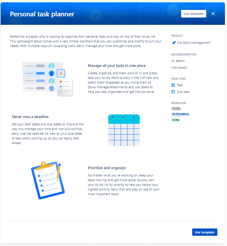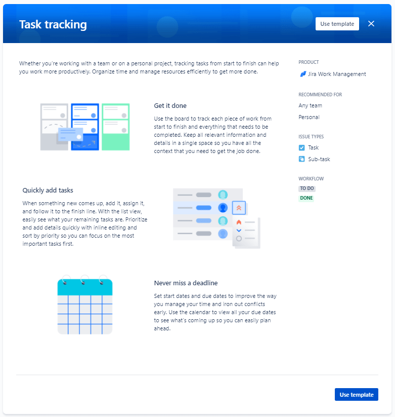This one is probably the most boring of the lot. It has two issue types (task and sub-task) and a simplified workflow shown above. I mean, this can work for task management; it’s here to serve as a blank canvas for you to create a bespoke project – should the need arise.