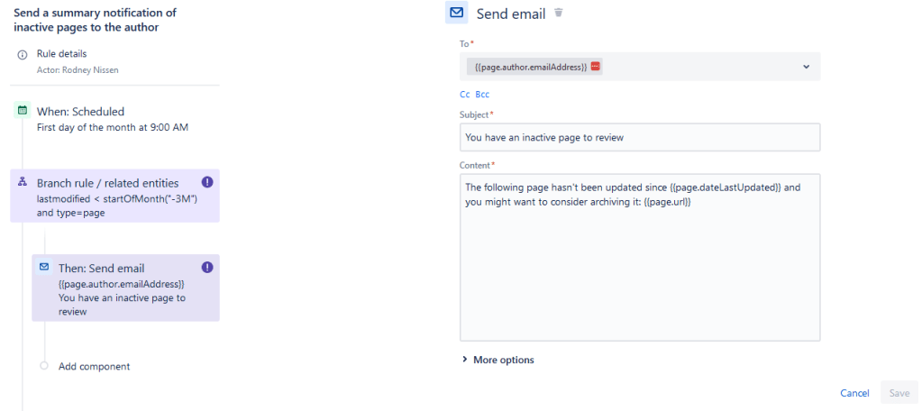 After the branch, we’ll have a second dangling line. This location is where we’ll attach our action, which in this case is to send a gentle reminder to update the page or archive it. It’s important to remember this action will be running for EACH returned object on the branch, so if you have too many tasks under a branch, it could slow down the system for everyone. Trust me, I’ve seen it with Automation for Jira.